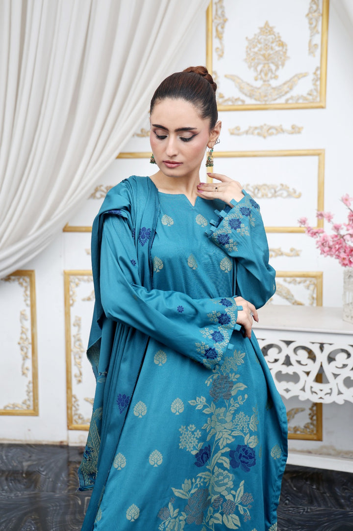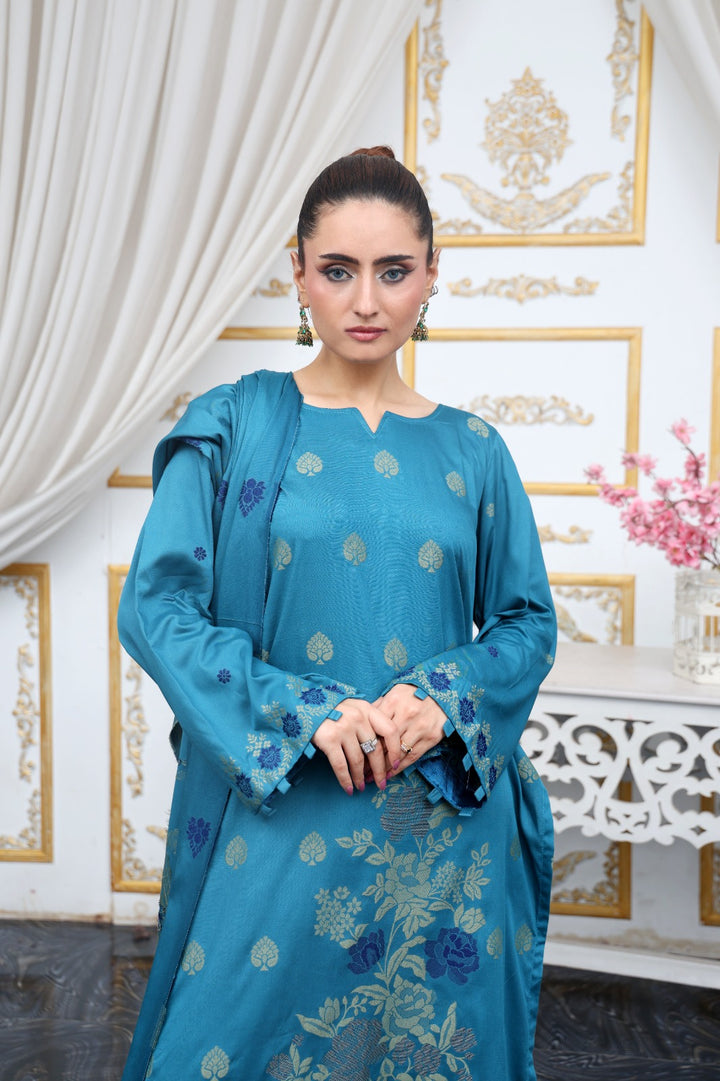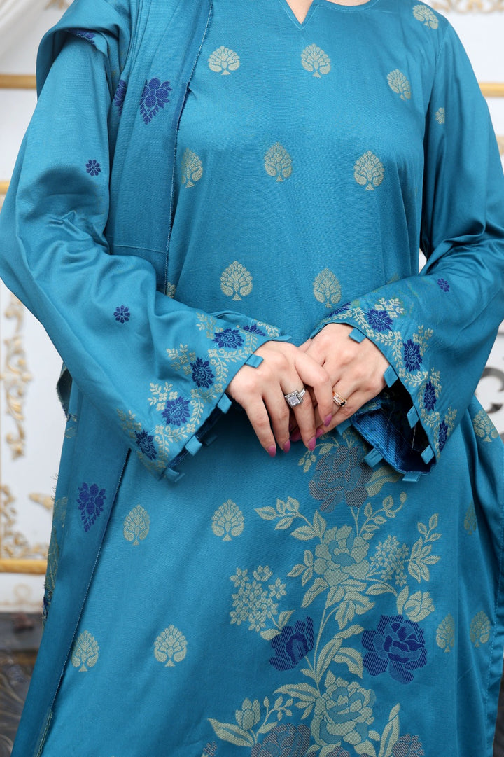 Experience understated luxury with our Banarsi Brosha Linen 3-Piece Suit, featuring an intricately woven Banarsi-inspired jacquard design in elegant gold and blue tones. Crafted from premium linen fabric, it offers a sophisticated look with a classic, timeless appeal.